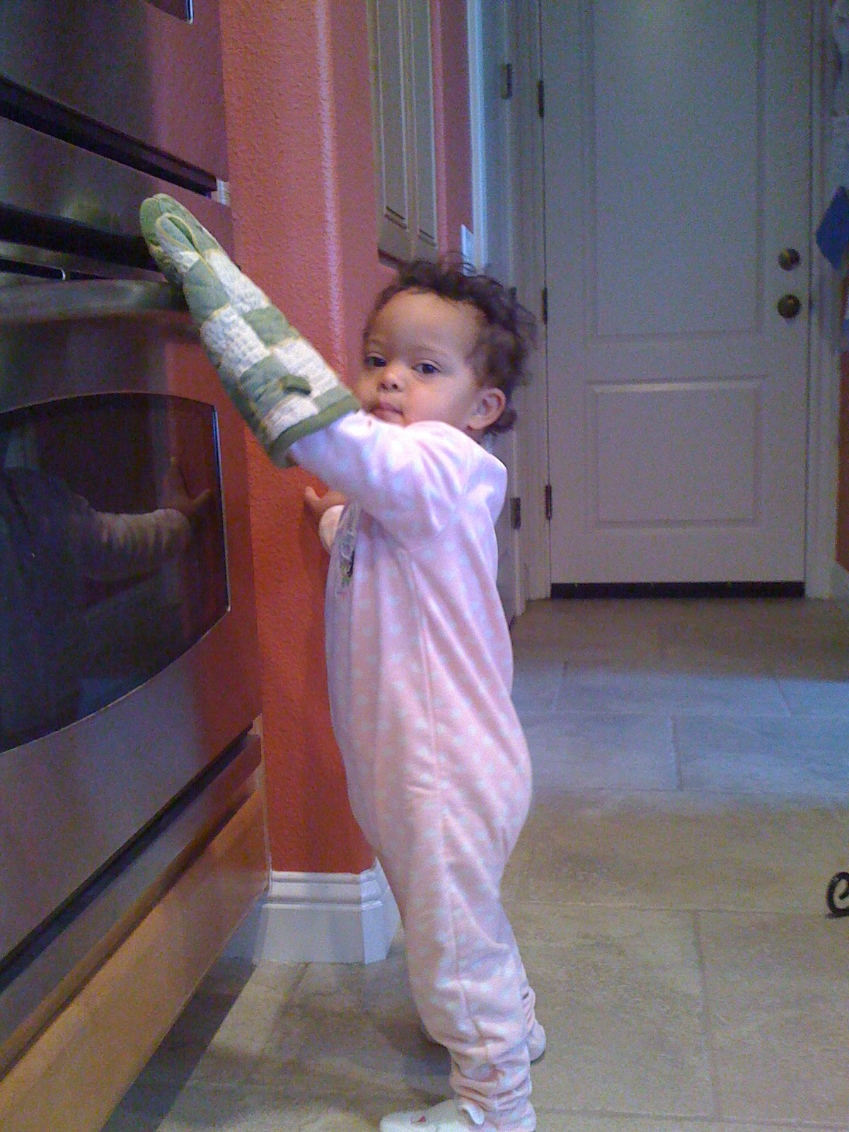 The other day she pulled the oven mittens out of the cabinet, went to the oven (with them on) and as she tried to open the oven door said "hot, hot".